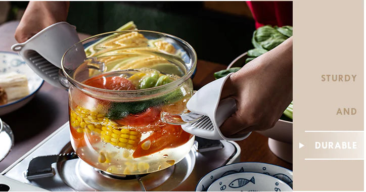 Ya sea que esté sacando una cazuela caliente del horno o manipulando ollas y sartenes calientes, nuestros guantes ofrecen una calidad profesional en la que puede confiar. Su diseño resistente al calor protege sus manos de quemaduras y ofrece una sensación ligera y flexible. ¡Además, olvídese de las manchas y los olores indeseados!